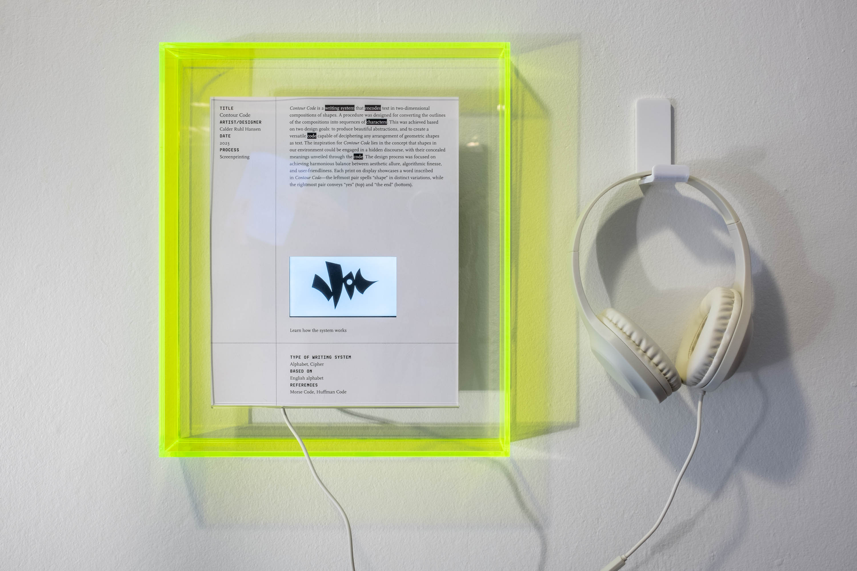 The works in the exhibition are rooted in this intersection. Delivered as font design projects, art books, scrolls, drawings, sculptures, and other artifacts, some works are intentionally designed to be functional writing systems, allowing potential usage by others, while some exist in a realm where functionality becomes entirely irrelevant: Calder Ruhl Hansen’s D16 Syllabics is an abugida (syllabary writing system where consonants have built-in vowels) drawing from Canadian Aboriginal syllabics; Coline Besson’s Arrakis, inspired by Frank Herbert’s science fiction novel Dune, is a sand plate inscribed with a rectilinear interpretation of the Arabic Kufic script; and Sound Clouds and Syllabaries by Ilka Helmig and Johannes Bergerhausen introduces a series of drawings capturing patterns of exhaled smoke generated during vocalization of syllables. Many of the projects in Quasi remain works-in-progress, mirroring the perpetual evolution of language itself—a fluid entity that lacks a definitive version and adapts in tandem with societal shifts.